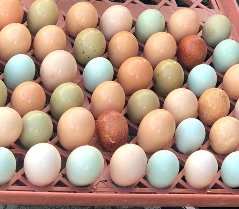 Our chickens keep producing a variety of outstanding eggs each week. Buy a dozen, come early as they sell out quick.